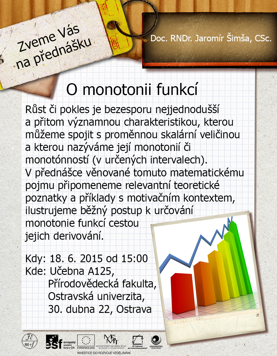 Ostravská pobočka JČMF zve 18. 6. 2015 všechny studenty, pedagogy a zájemce z řad veřejnosti na přednášku „O monotonii funkcí". Přednáší doc. RNDr. Jaromír Šimša, CSc. z Ústavu matematiky a statistiky Přírodovědecké fakulty Masarykovy univerzity v Brně. Přednáška se koná v učebně A125 na Přírodovědecké fakultě Ostravské univerzity, ul. 30. dubna 22, Ostrava. Více informací v přiložené pozvánce.