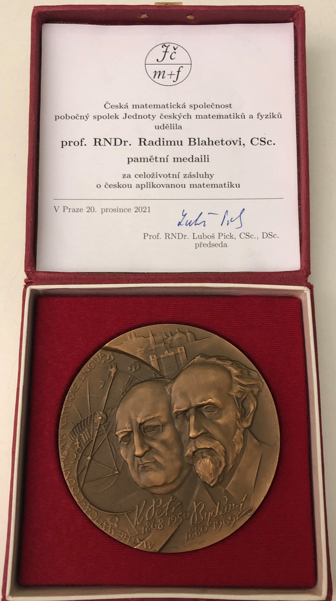 Prof. RNDr. Radim Blaheta, CSc. obdržel pamětní medaili za celoživotní zásluhy o českou aplikovanou matematiku od České matematické společnosti, která je pobočným spolkem Jednoty českých matematiků a fyziků. Prof. Blaheta se zabýval numerickou matematikou a aplikacemi matematiky především v geotechnických a environmentálních oborech, ve kterých se mu dostalo výrazného mezinárodního uznání.